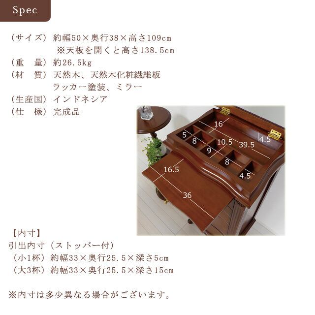 高級木材マホガニーを使用したエレガントなチェスト、天板裏面はフェイスミラー付です。