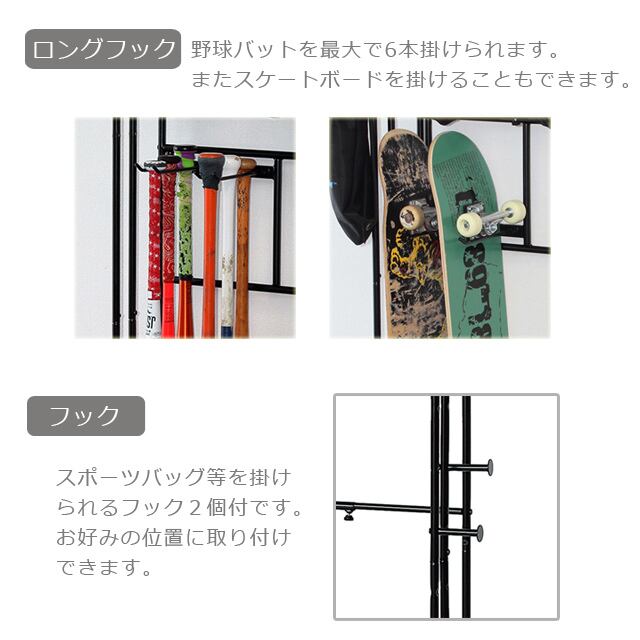 ◆ロングフックには、野球バットを最大で6本掛けられます。またスケートボードを掛けることもできます。