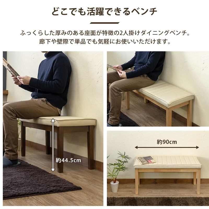 ふっくら厚みのある座面が特徴の2人掛けダイニングベンチです。