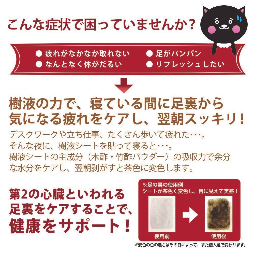 樹液シートの主成分(木酢・竹酢パウダー)の吸収力で余分な水分を吸ってくれますので、翌朝剥がすとシートが茶色に変色します。